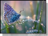 Motyl, Modraszek, Trawa, Źdźbło, Krople, Rosa, Grafika AI