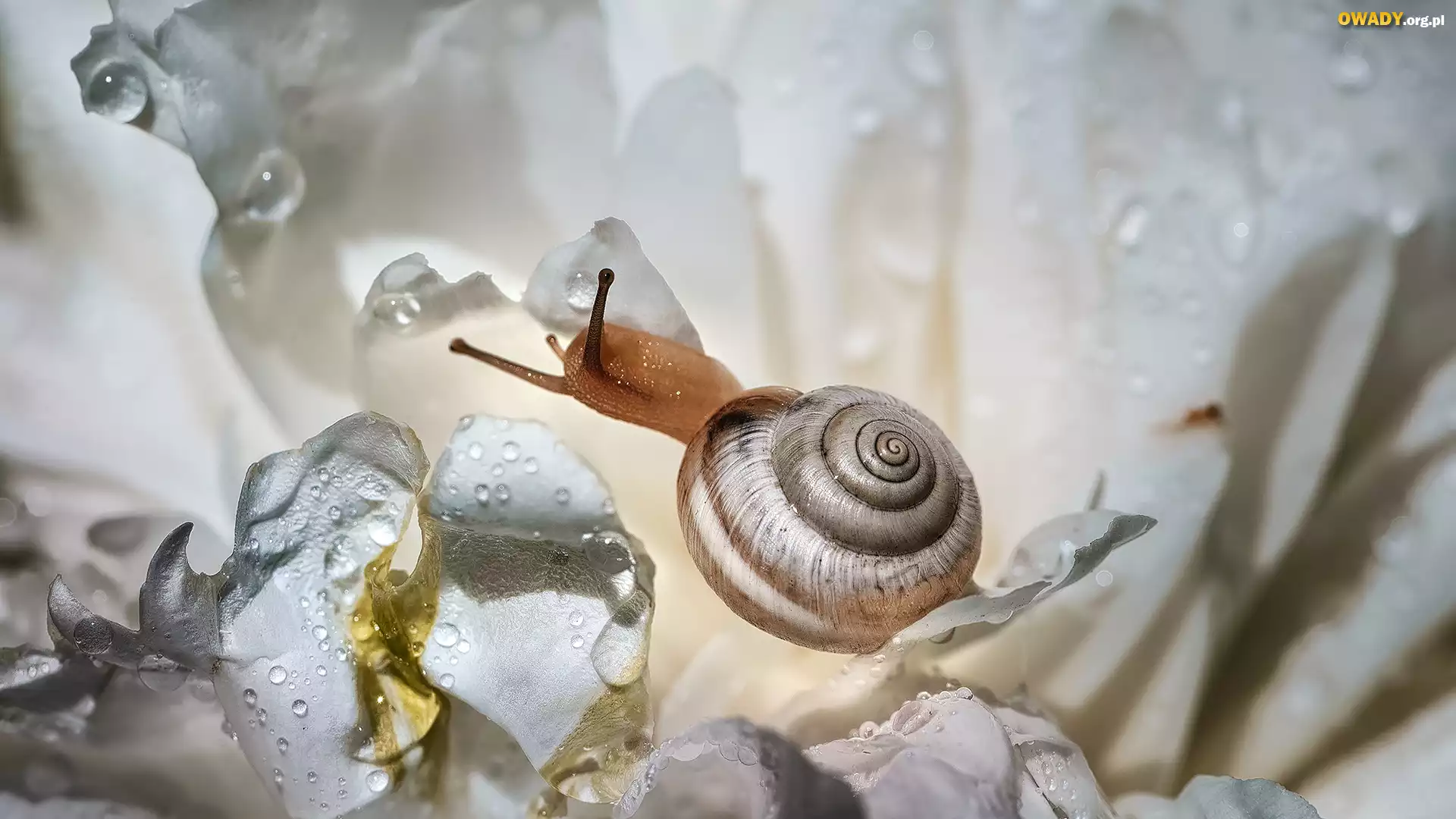 Białe, Kwiaty, Krople, Ślimak, Makro