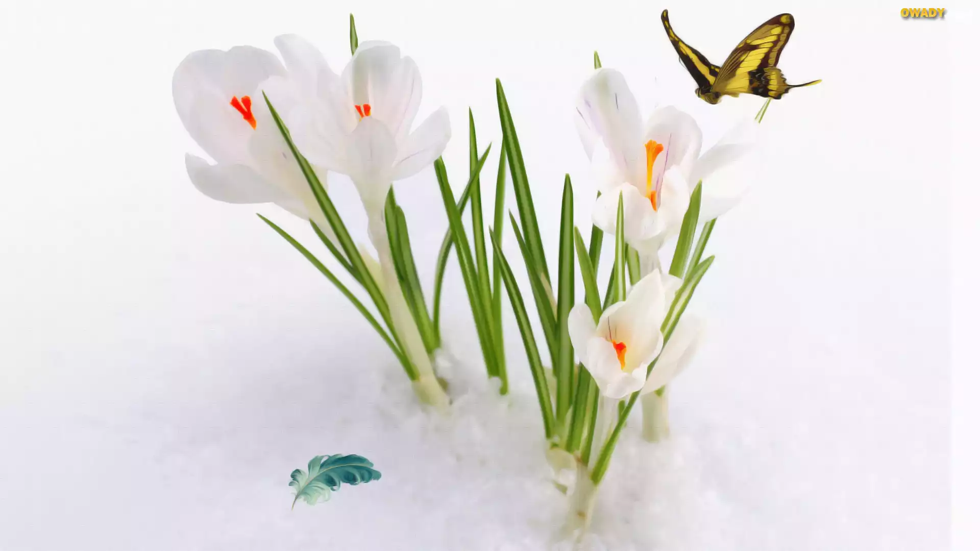 Białe, Krokusy, Śnieg, Motylek, Piórko
