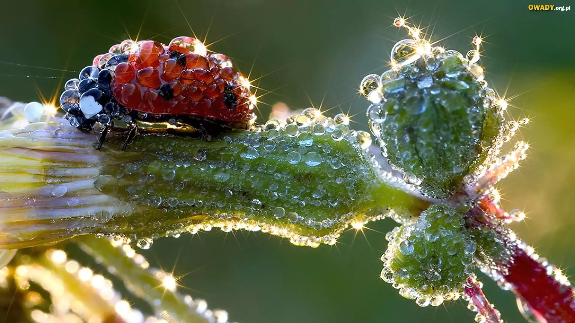 Biedronka Biedronka, Zielona, Roślina Biedroneczka Biedronka, Siedmiokropka Biedronka Biedronka, Pąki, Kwiatów Dużo, Biedronek Biedronka, Krople, Deszczu Biedronki Biedronka, Kropki Biedronka, Skrzydełka Biedronka, Niebo, Biały, Kwiat Biedronka Czerwona, Biedronka