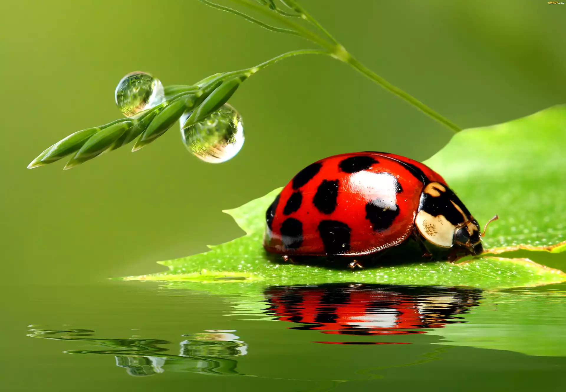 Biedronka, Liść, Krople, Woda, Odbicie