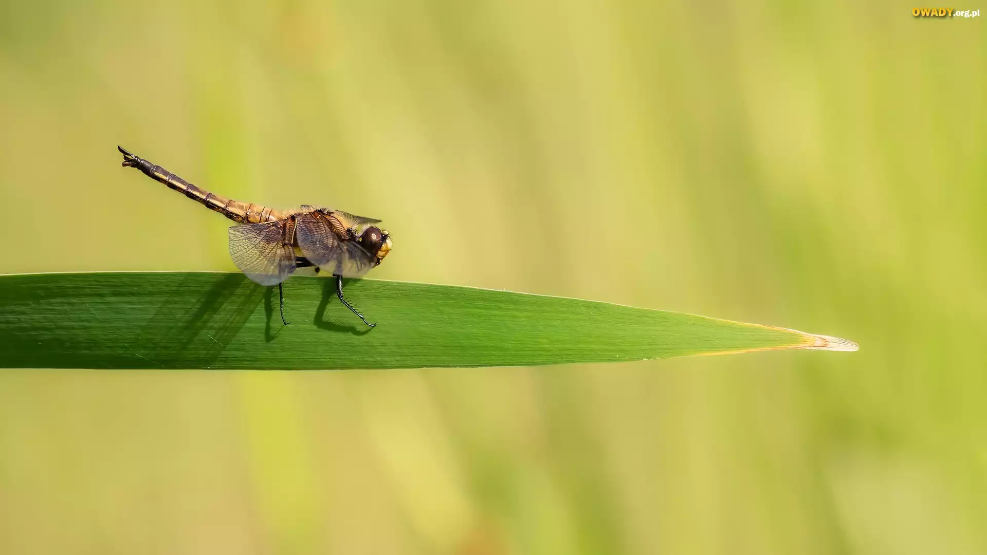 Ważka czteroplama, Libellula quadrimaculata, Trawa, Źdźbło, Zbliżenie