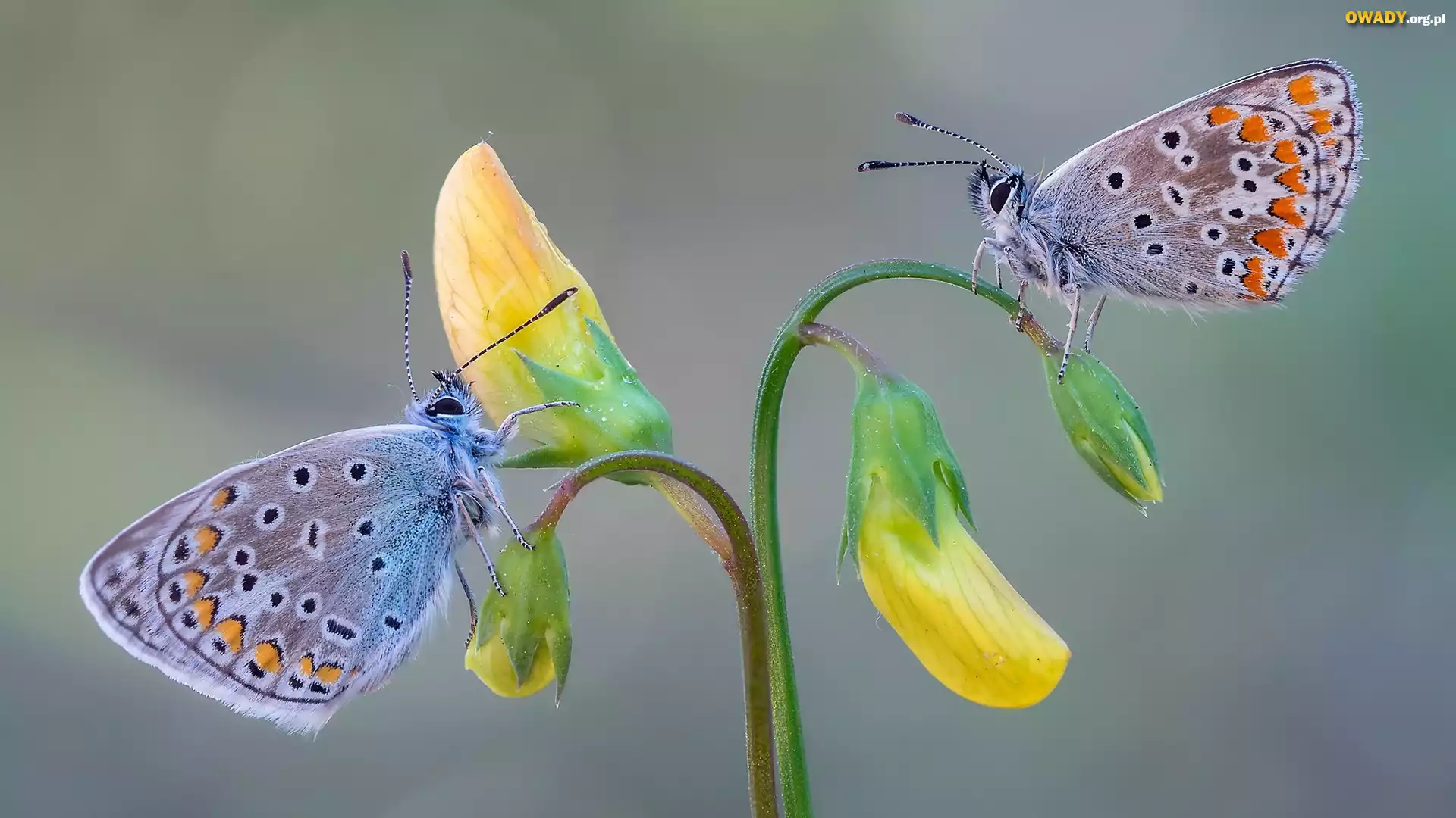 Dwa, Motyle, Modraszki ikary, Żółte, Kwiaty