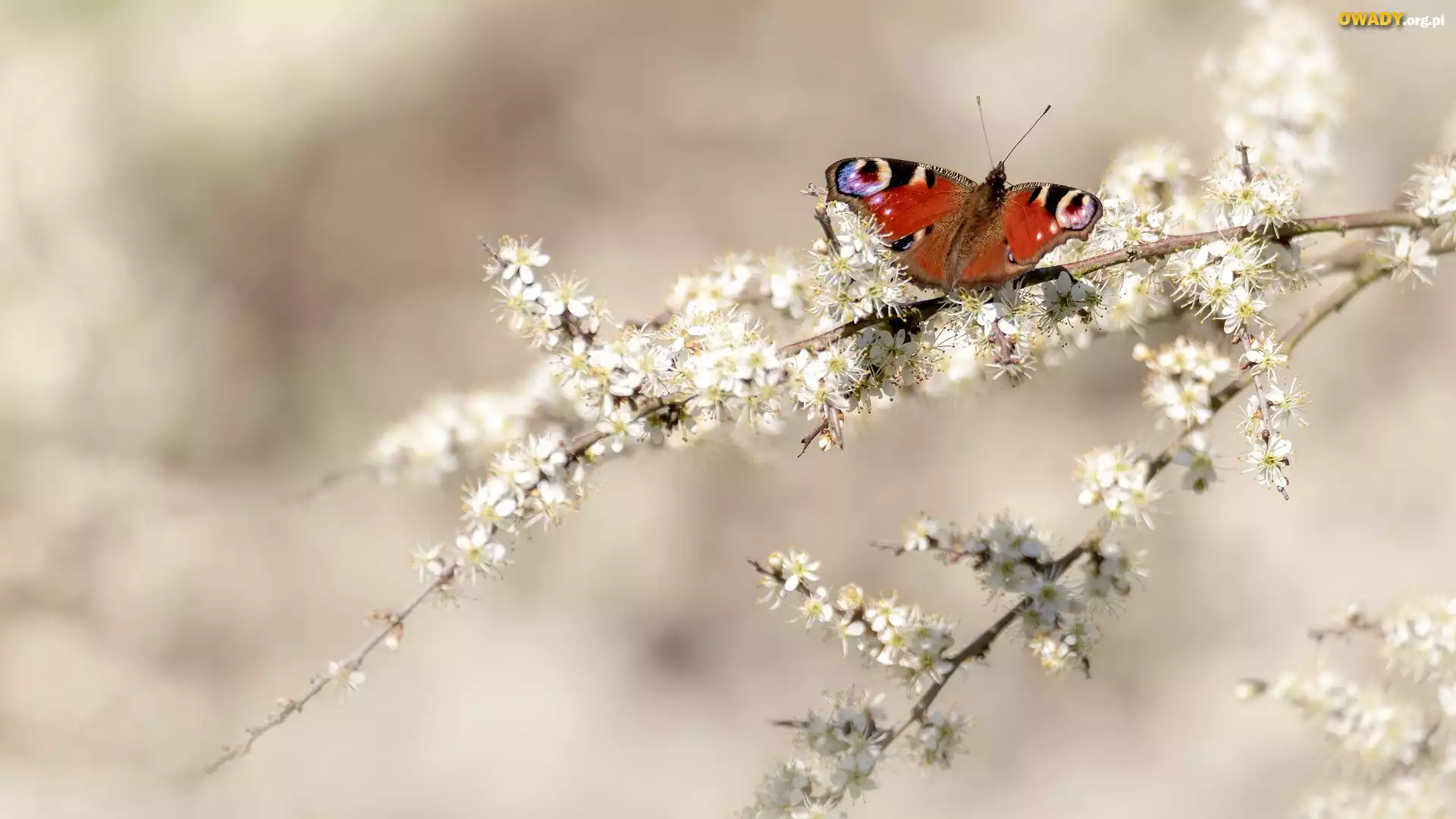 Gałązki, Białe, Kwiaty, Motyl, Rusałka pawik