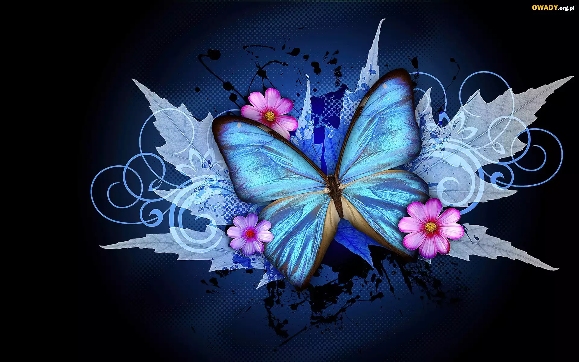 Grafika 2D, Niebieski, Motyl, Kwiaty