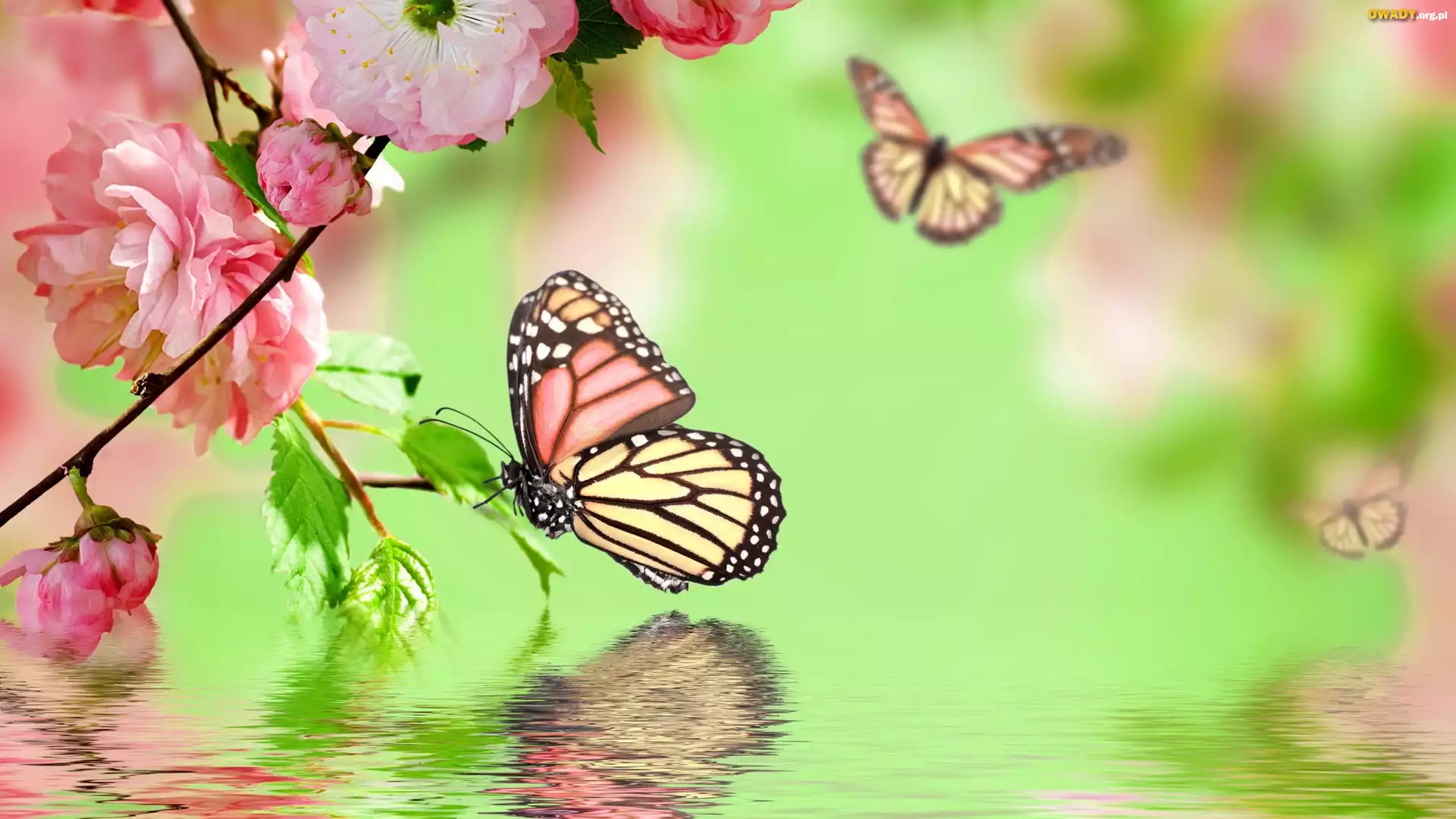 Grafika, Różowe, Kwiaty, Motyle, Woda
