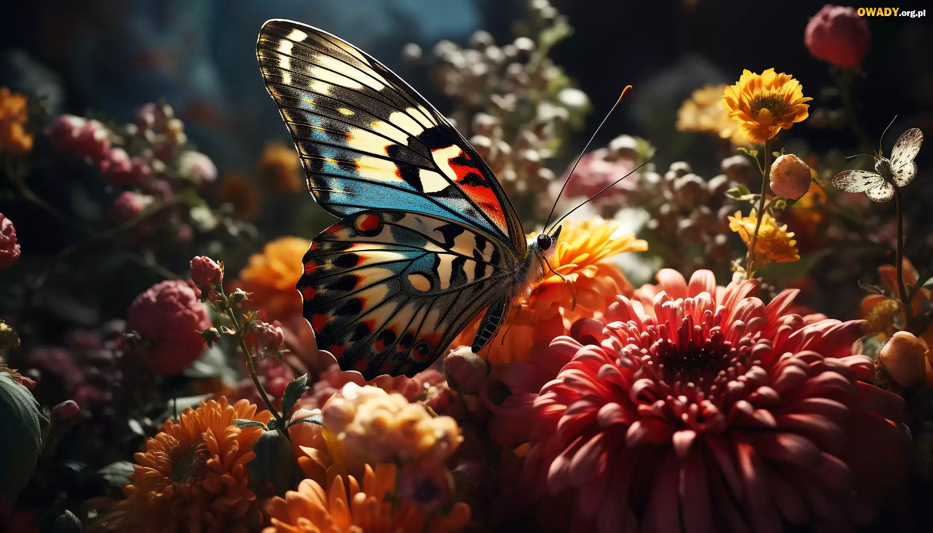 Kwiaty, Kolorowy, Motyl, Światło, Grafika