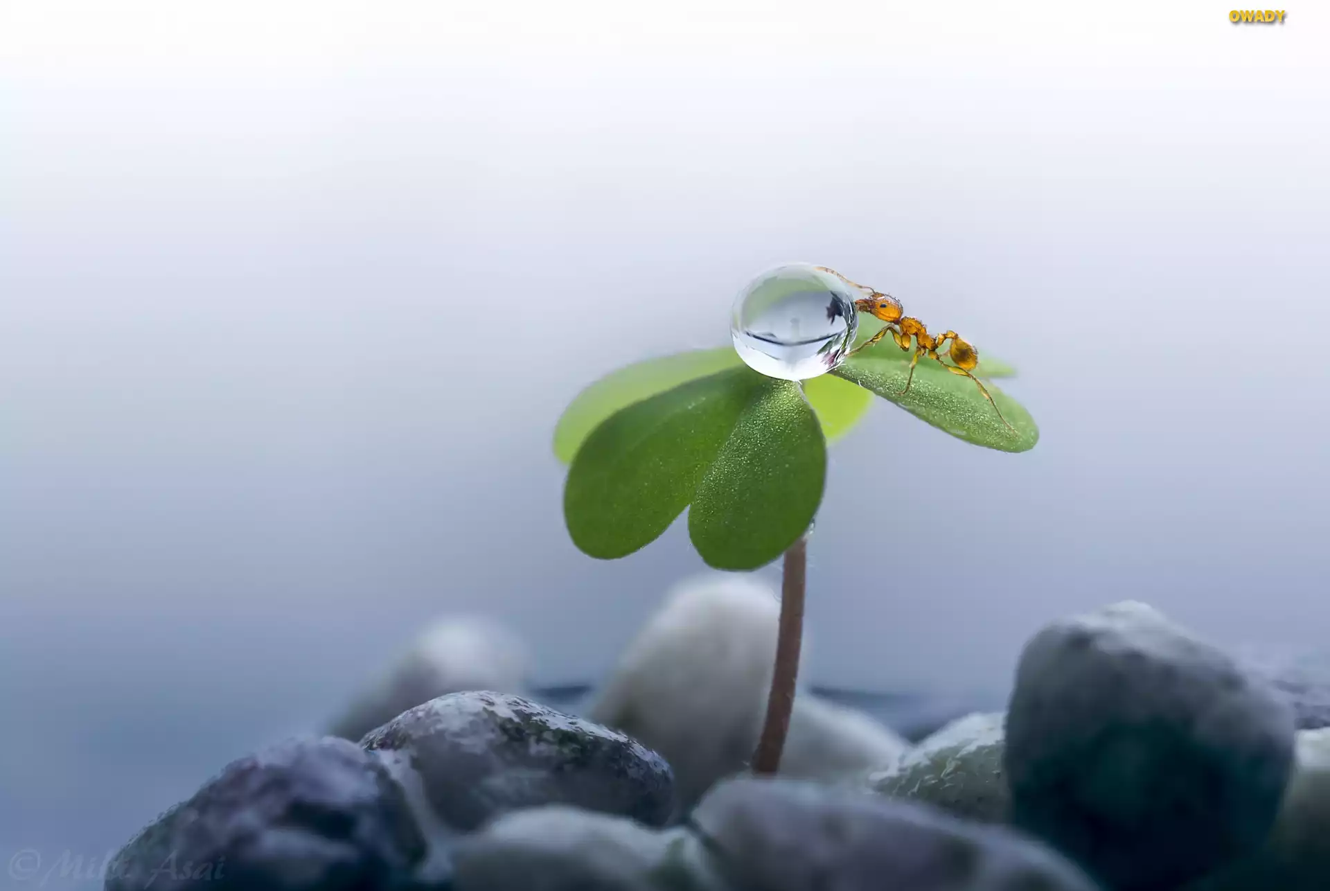 Koniczynka, Kropla, Mrówka, Kamyki, Makro