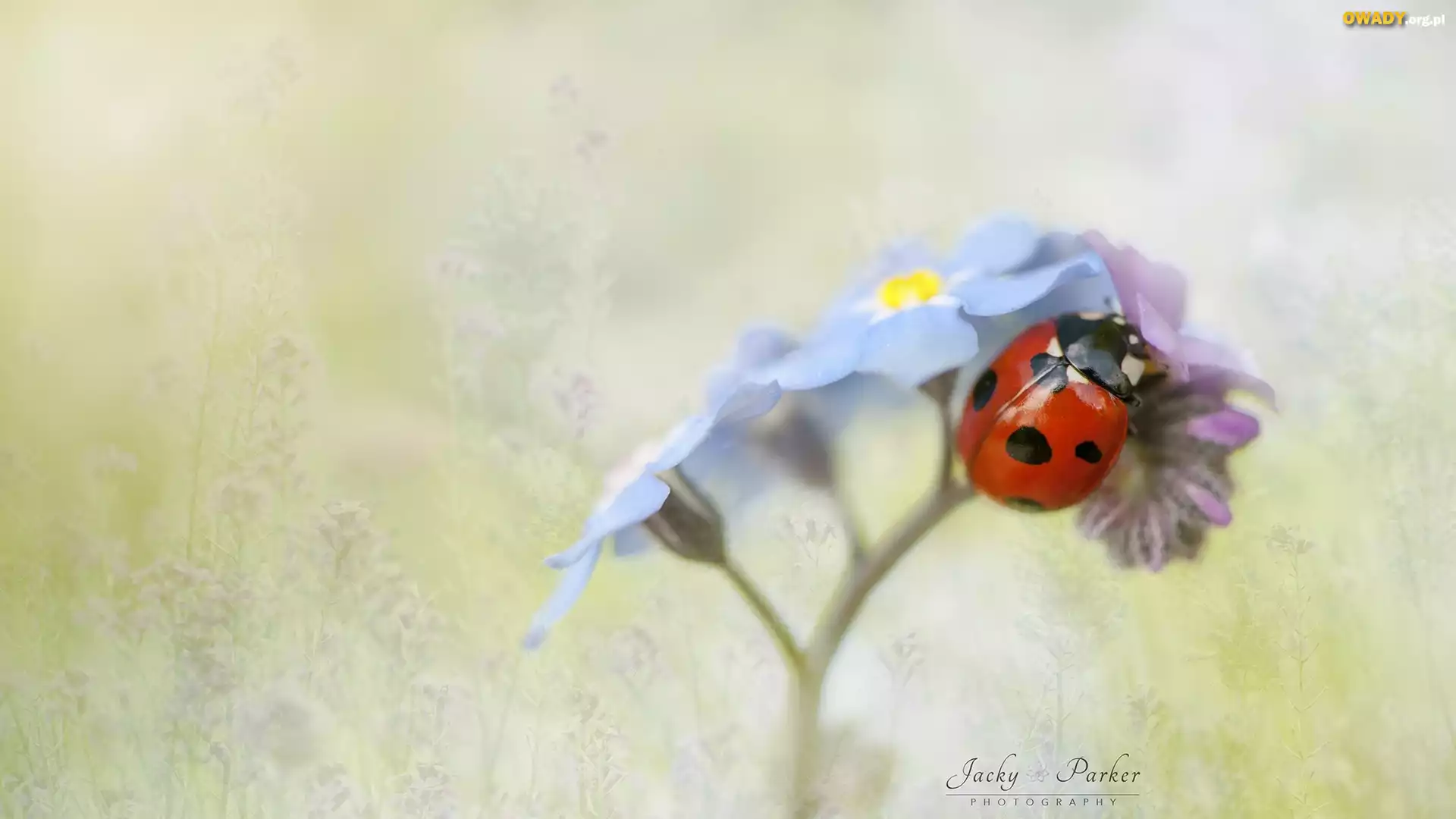 Niebieski, Kwiat, Niezapominajka, Biedronka, Rozmycie, Makro Niezapominajka