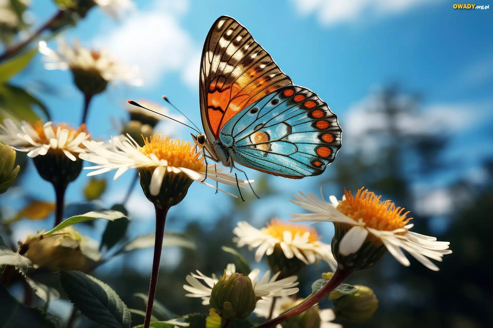 Kolorowy, Motyl, Białe, Kwiaty, Niebo, Grafika