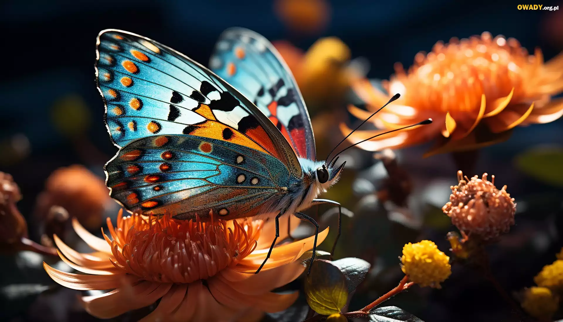 Niebieski, Motyl, Pomarańczowe, Kwiaty, Światło, Grafika