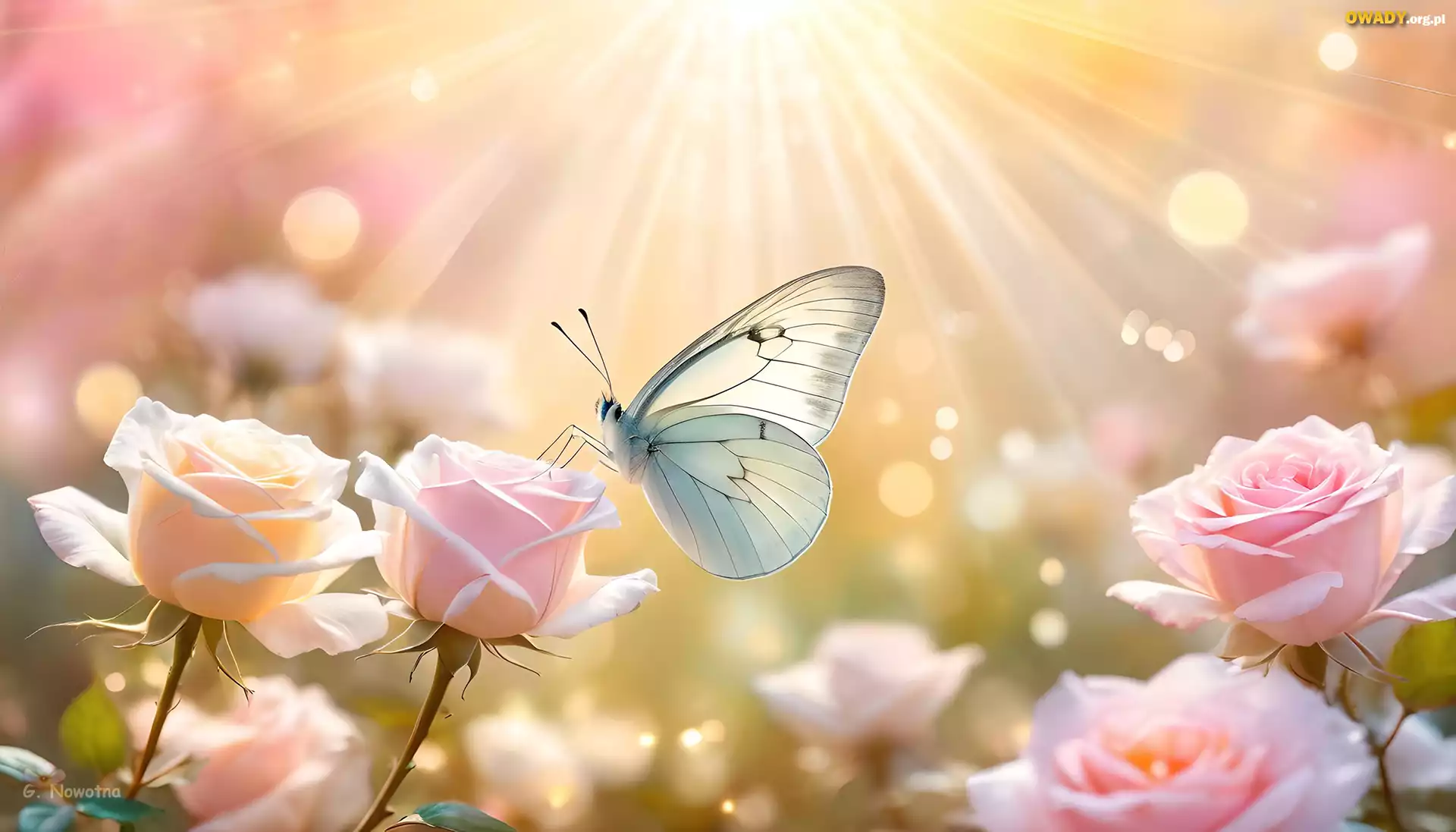 Motyl, Różowe, Róże, Kwiaty, Słońce, Grafika
