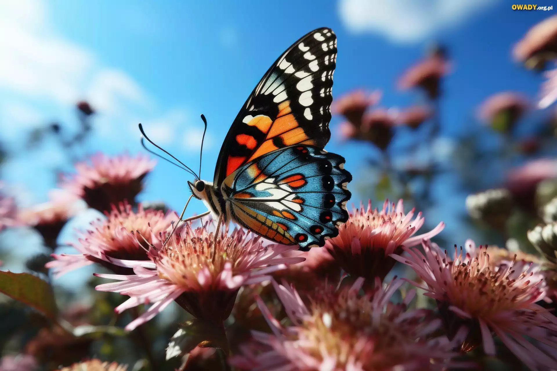 Kolorowy, Motyl, Różowe, Kwiaty, Niebo, Grafika