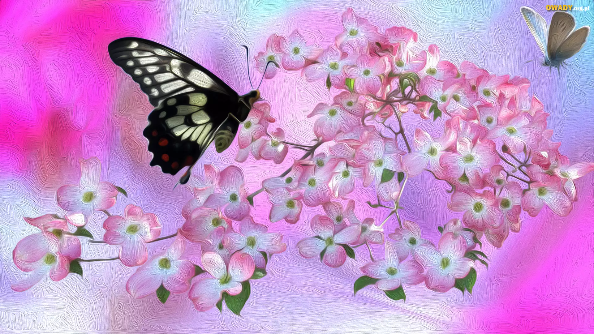 Kwiaty, Motyle, Kolorowe tło, Grafika