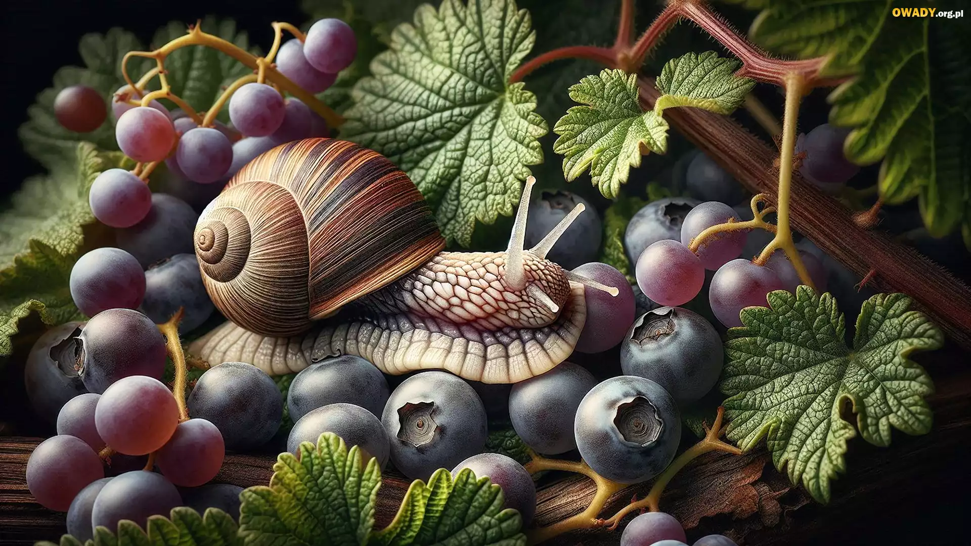 Ślimak, Owoce, Winogrona, Liście, Borówki, Grafika
