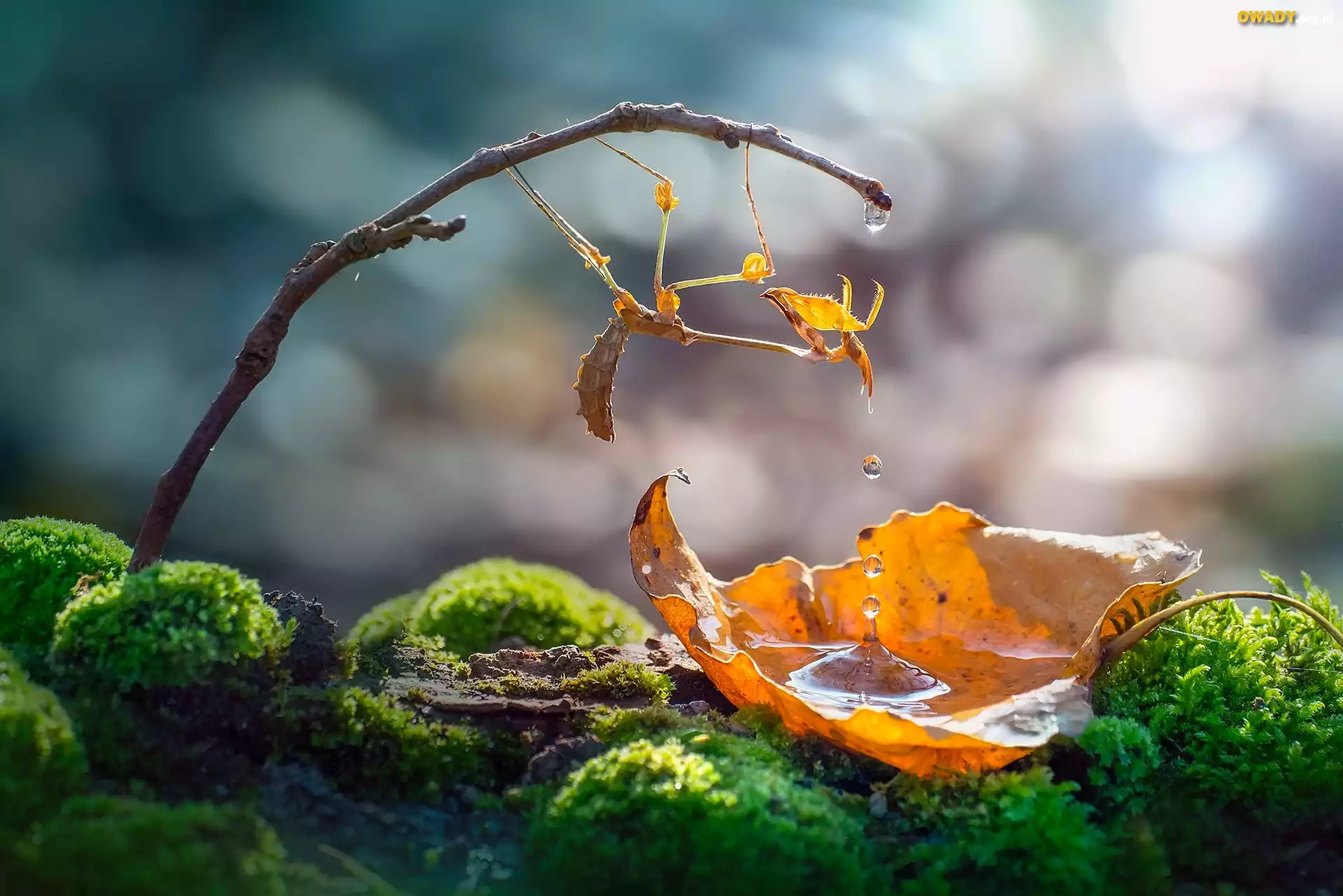 Makro, Modliszka, Liść, Mech, Krople, Woda