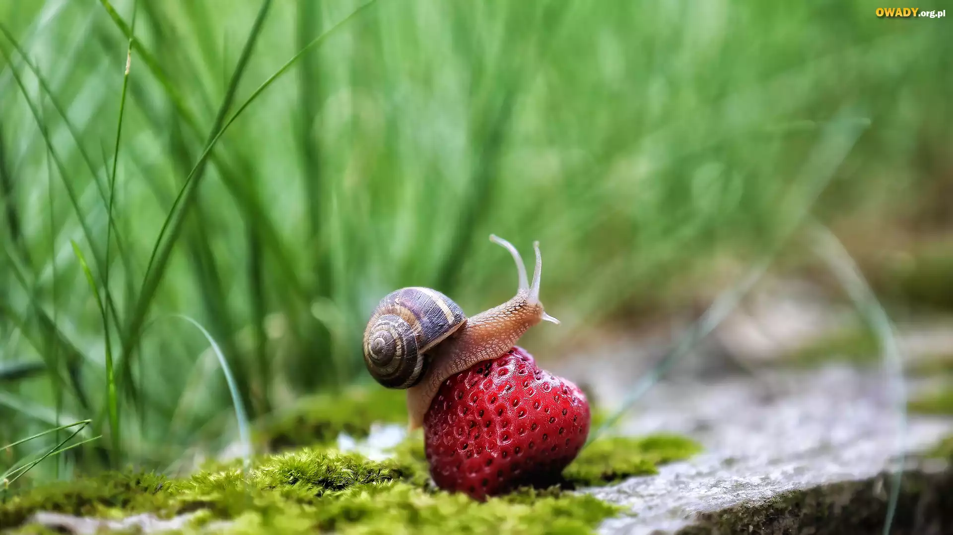 Ślimak, Truskawka, Trawa, Mech, Zbliżenie