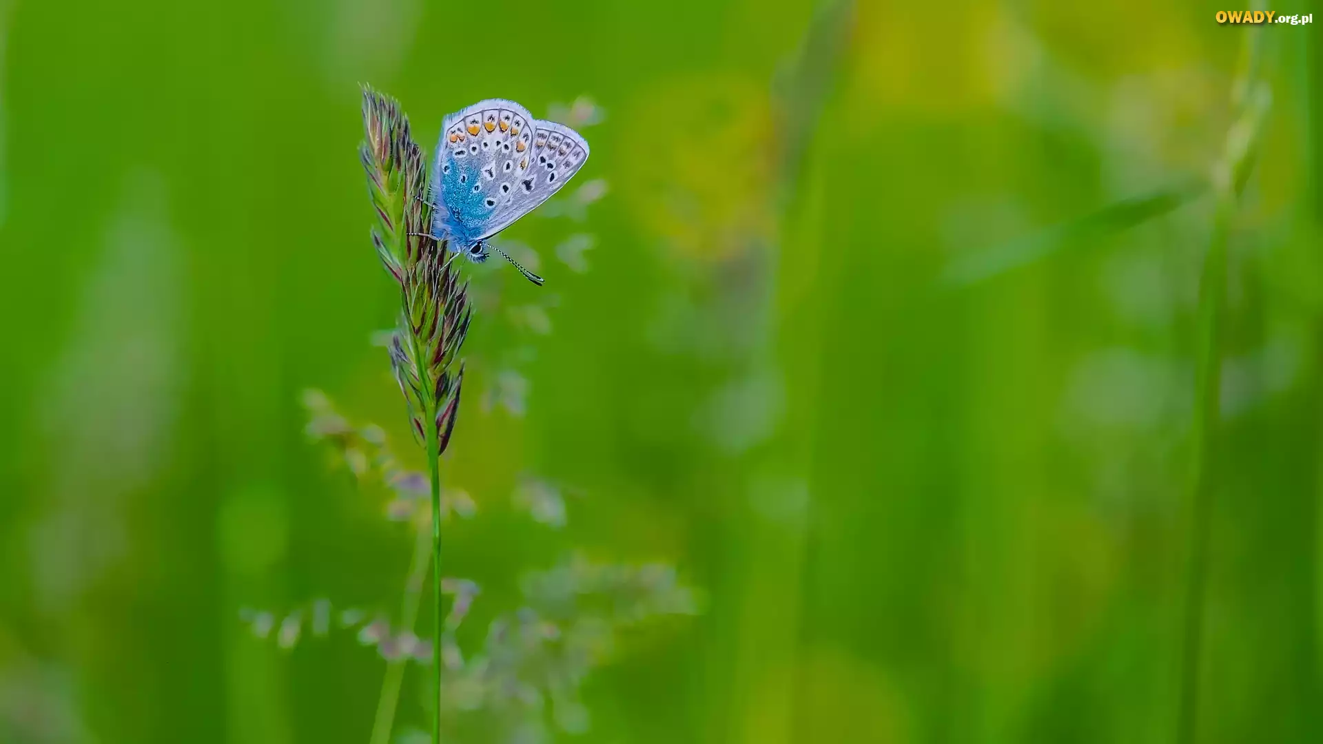 Motyl, Modraszek ikar, Źdźbło, Trawa, Zielone, Tło