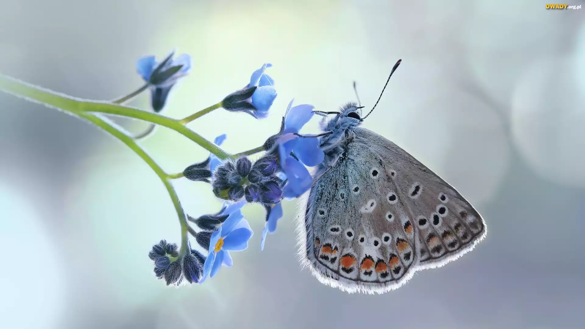 Motyl, Modraszek ikar, Kwiat, Niezapominajka, Makro