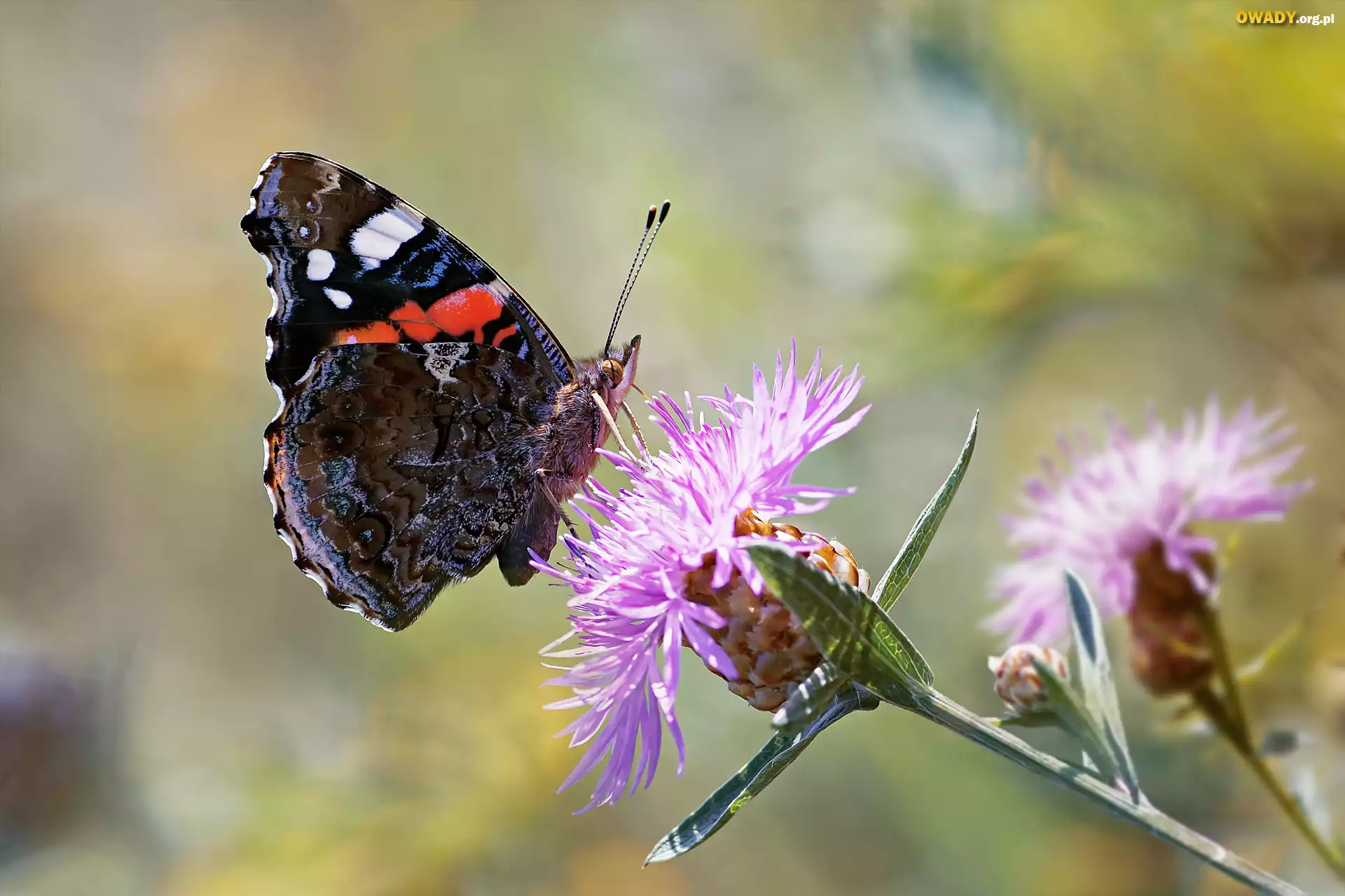Motyl, Rusałka admirał, Kwiaty, Rozmyte, Tło