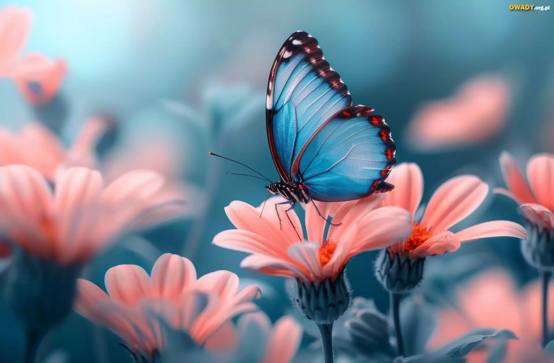 Niebieski, Motyl, Różowe, Kwiaty, Grafika