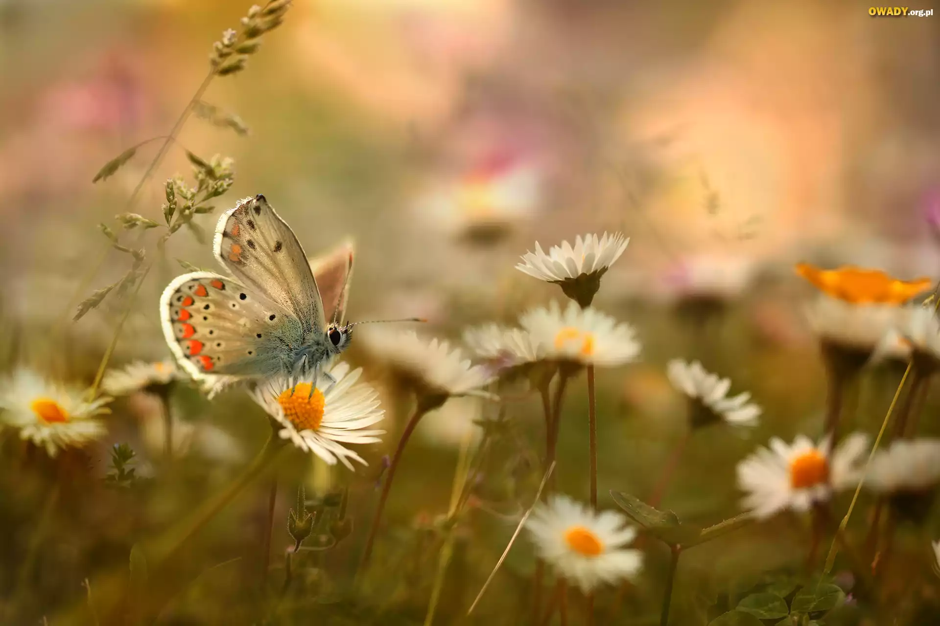 Motyl, Modraszek, Stokrotki, Kwiaty