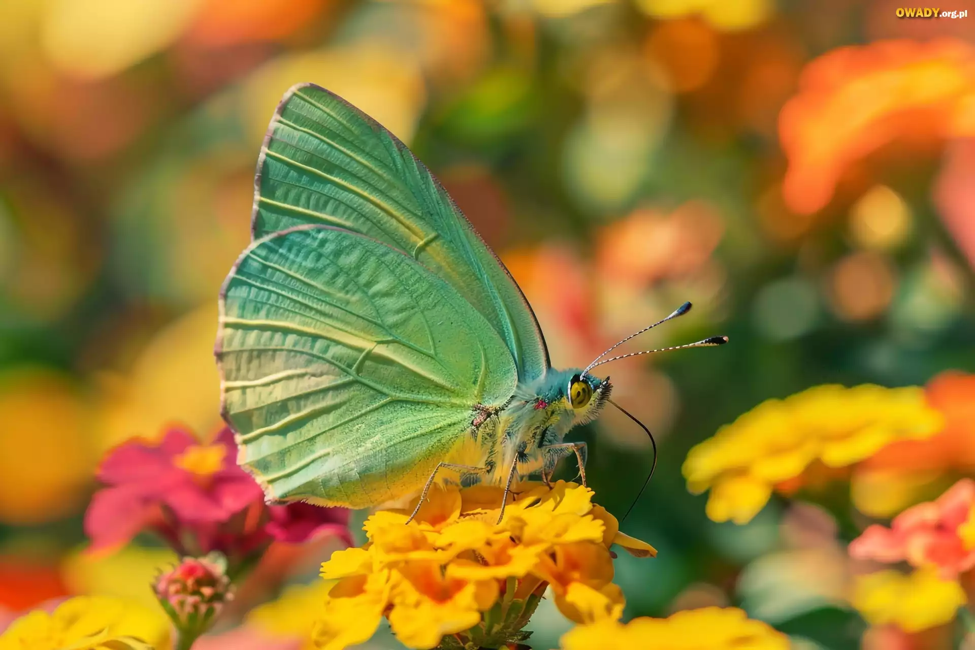 Zielony, Motyl, Żółte, Kwiaty, Grafika