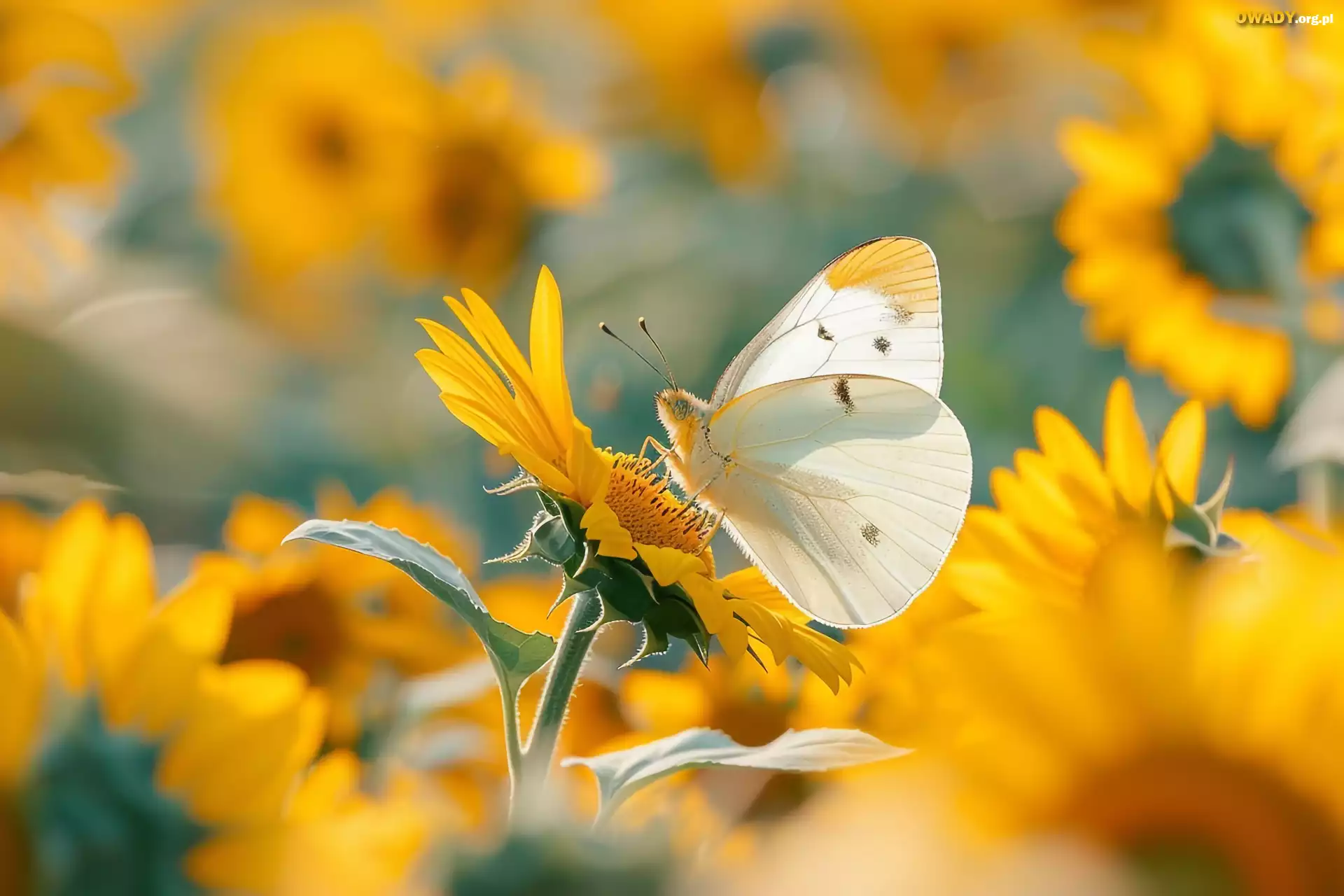 Biały, Motyl, Żółte, Kwiaty, Słoneczniki