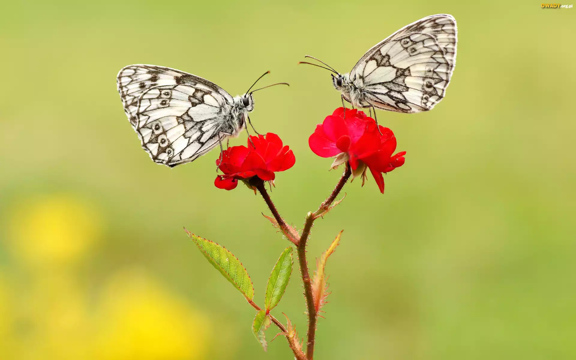 Dwa, Motyle, Polowiec szachownica, Czerwone, Kwiaty, Róże
