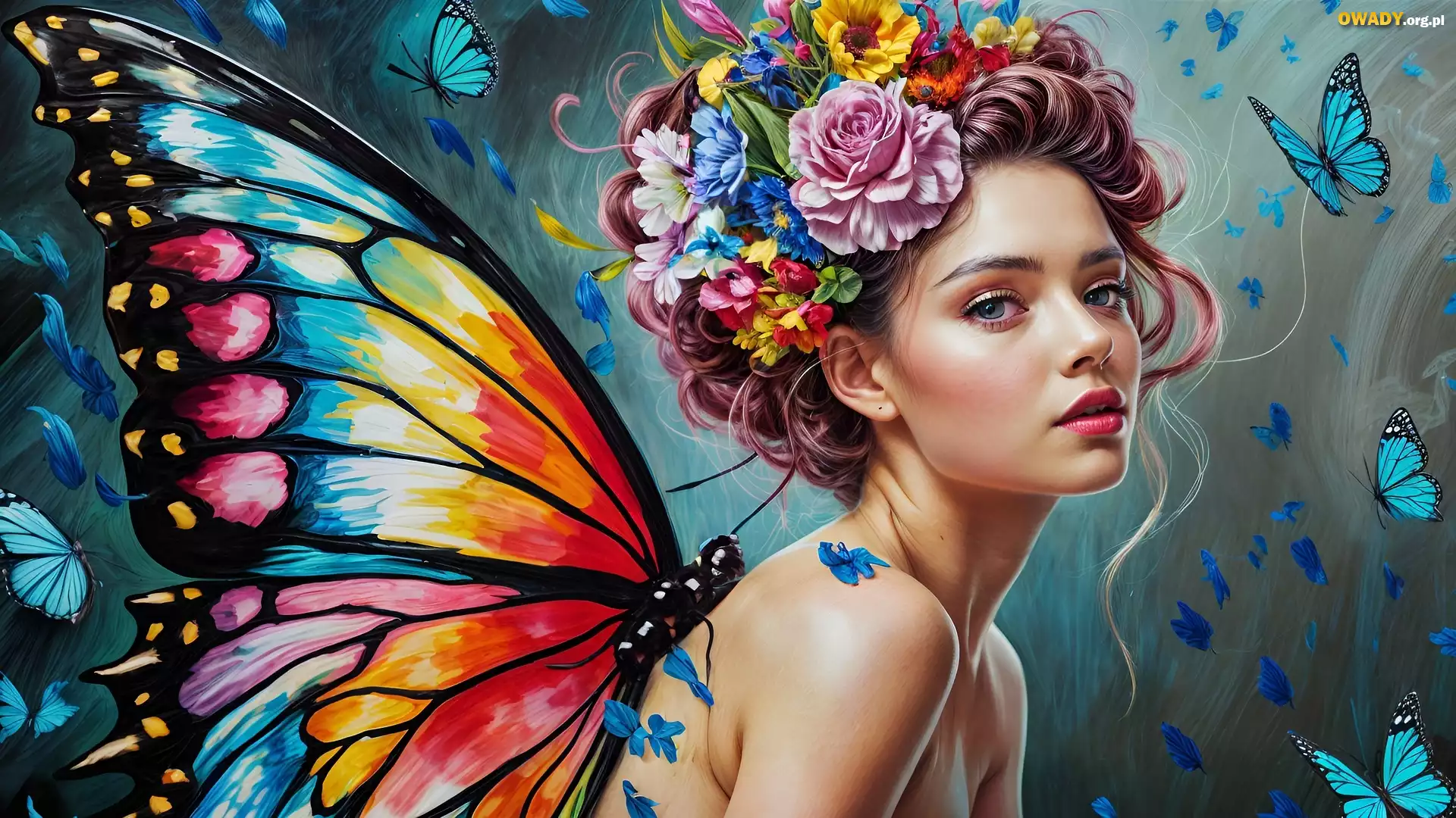 Dziewczyna, Motyle, Kwiaty, Skrzydła, Grafika