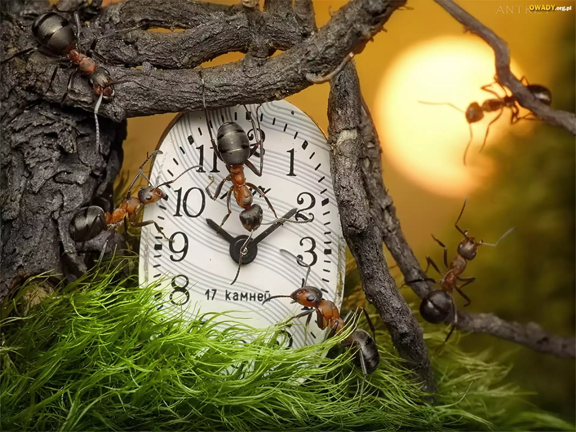 Mrówki, Zegar, Konar, Trawa