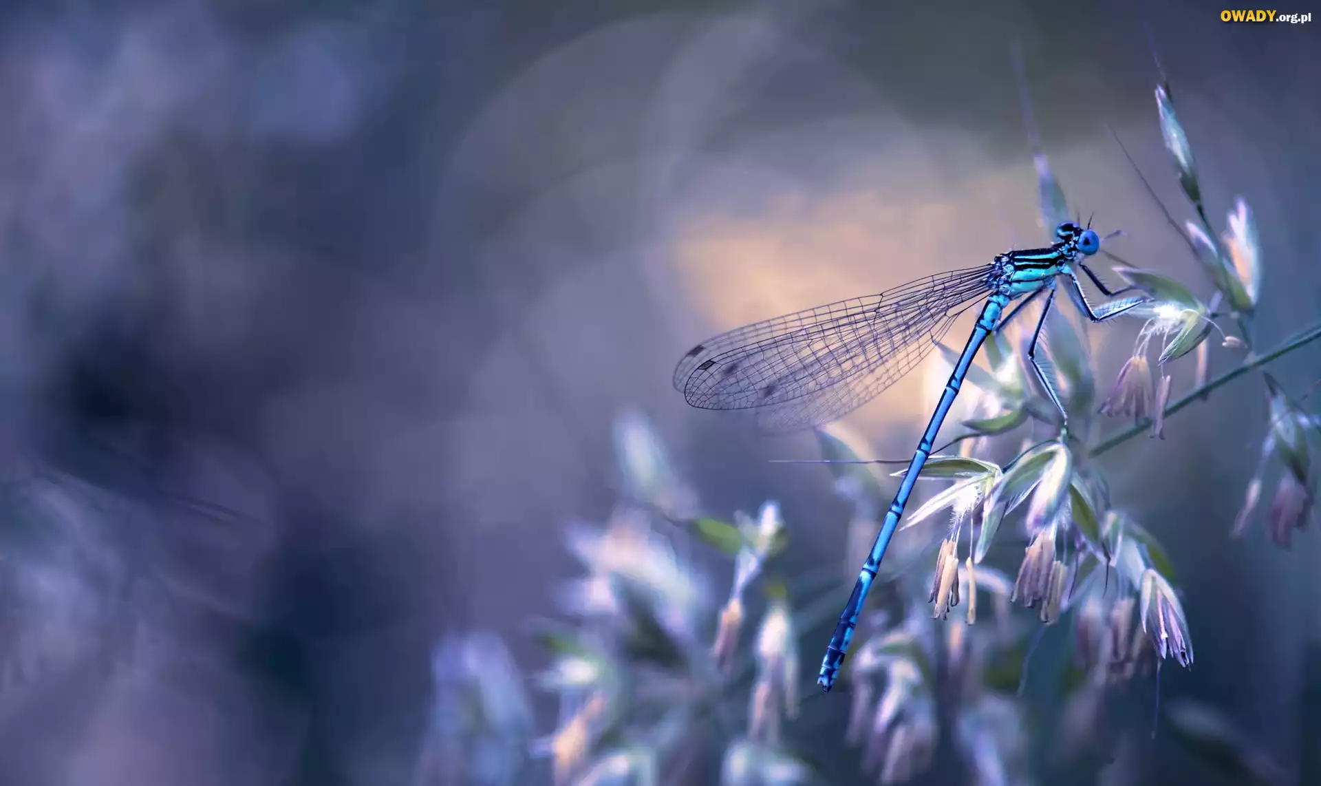 Niebieska, Ważka, Roślinka, Kwiatki, Światło, Bokeh