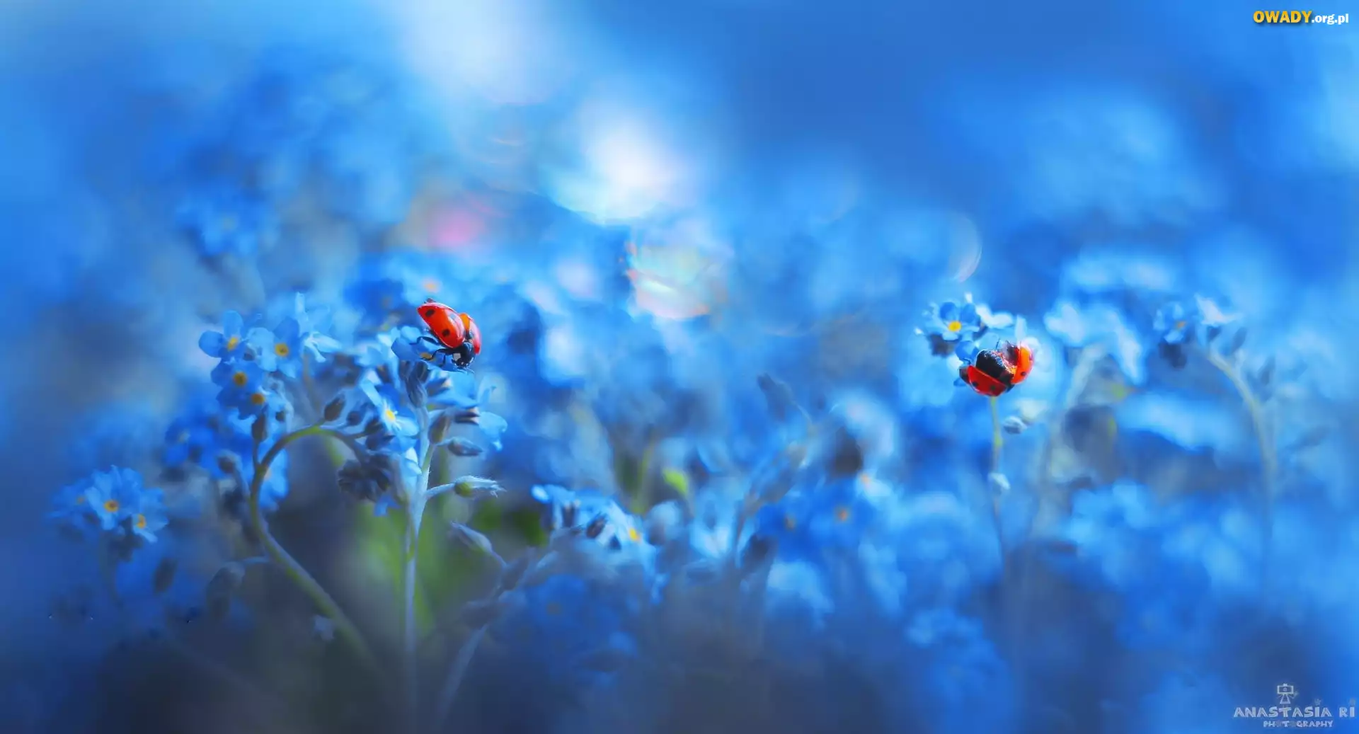 Niebieskie, Kwiatki, Niezapominajki, Dwie, Biedronki