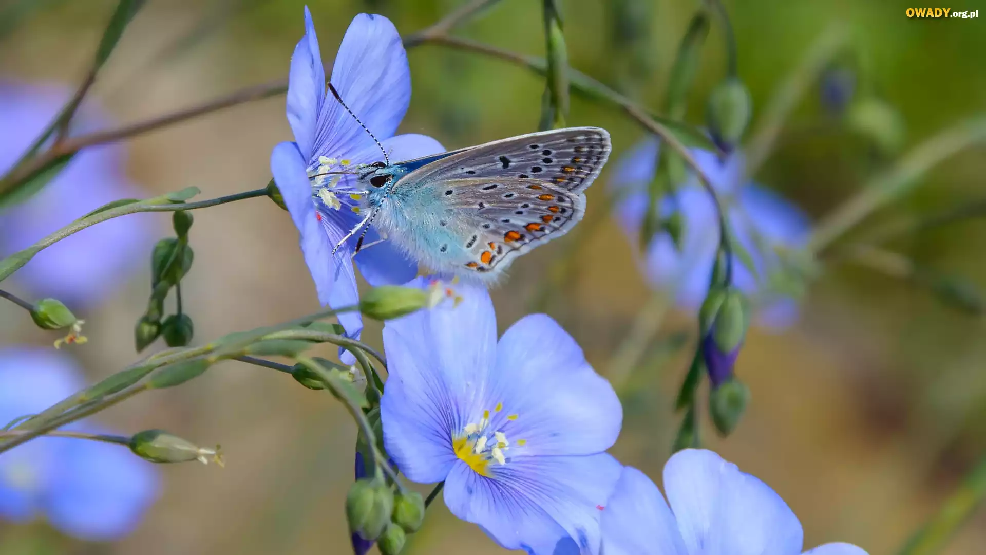 Niebieskie, Kwiaty, Len, Motyl, Modraszek ikar