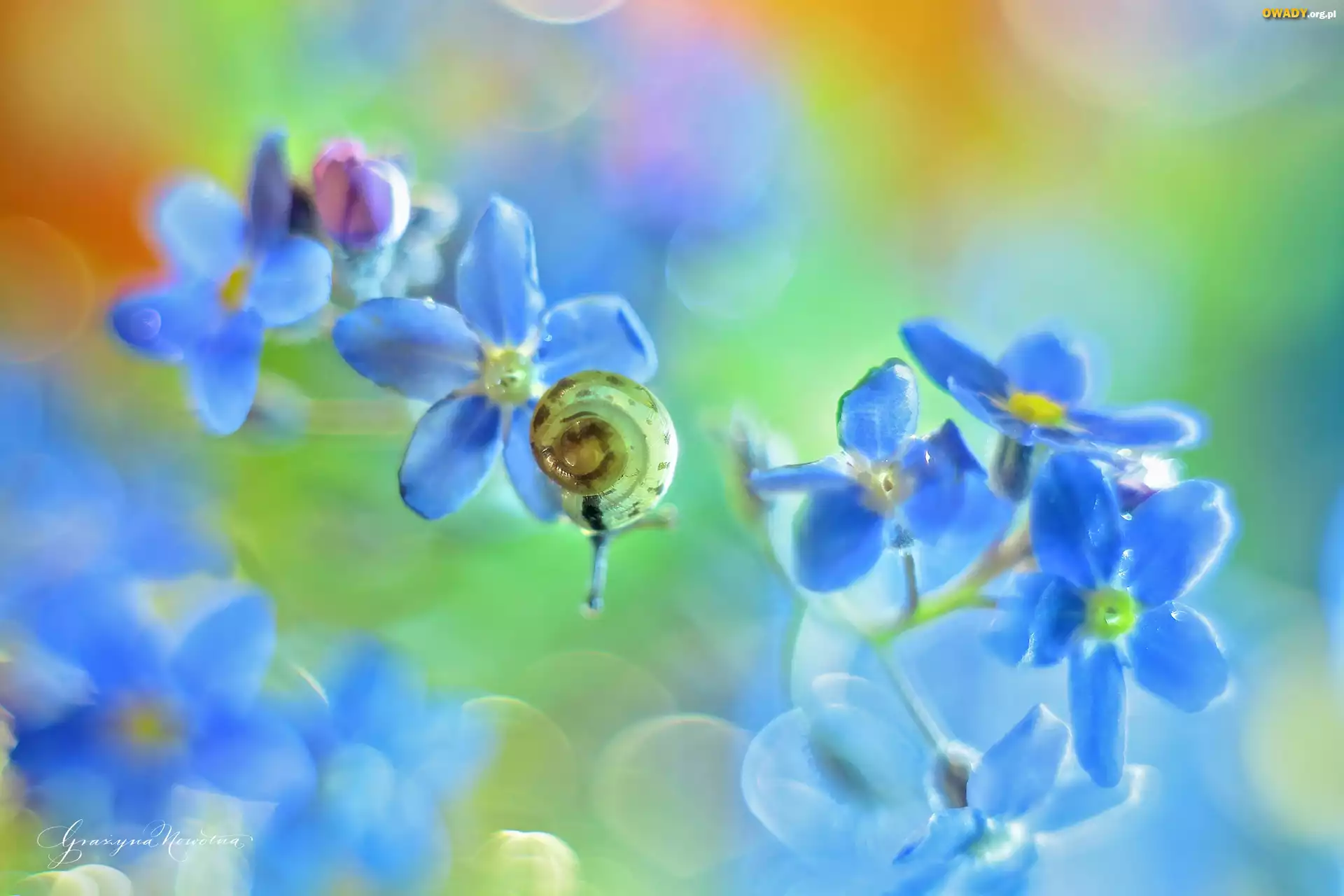 Niezapominajki, Niebieskie, Kwiaty, Ślimaczek, Mały