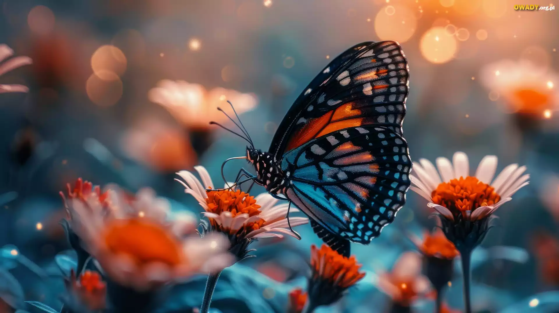 Niebiesko-pomarańczowy, Motyl, Białe, Kwiaty