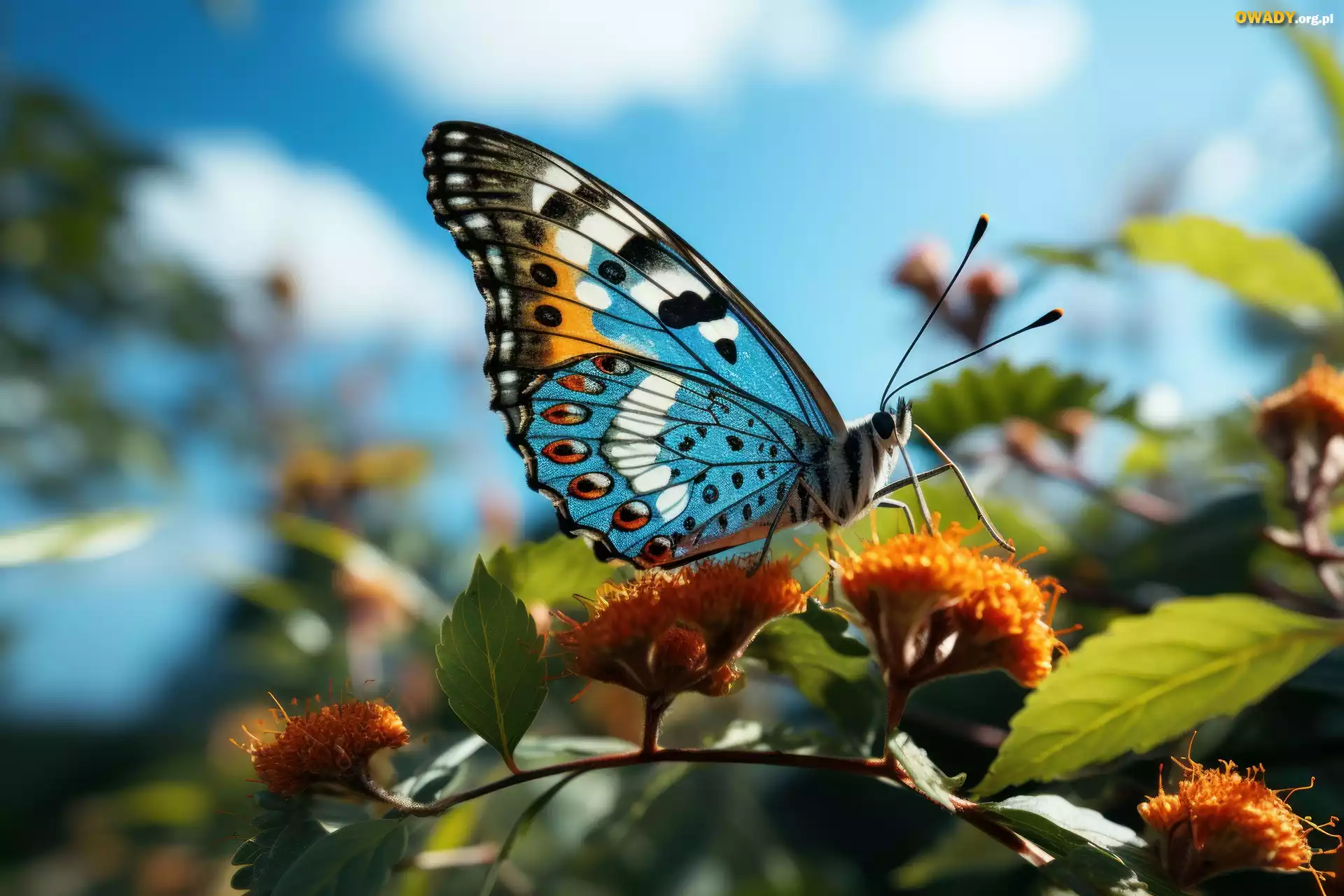 Motyl, Roślina, Kwiaty, Niebo, Grafika