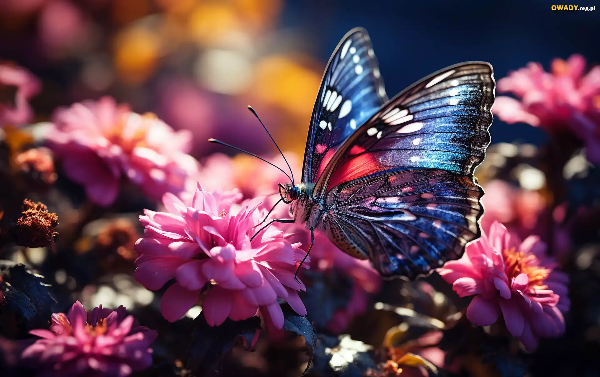 Motyl, Różowe, Kwiaty, Światło, Grafika