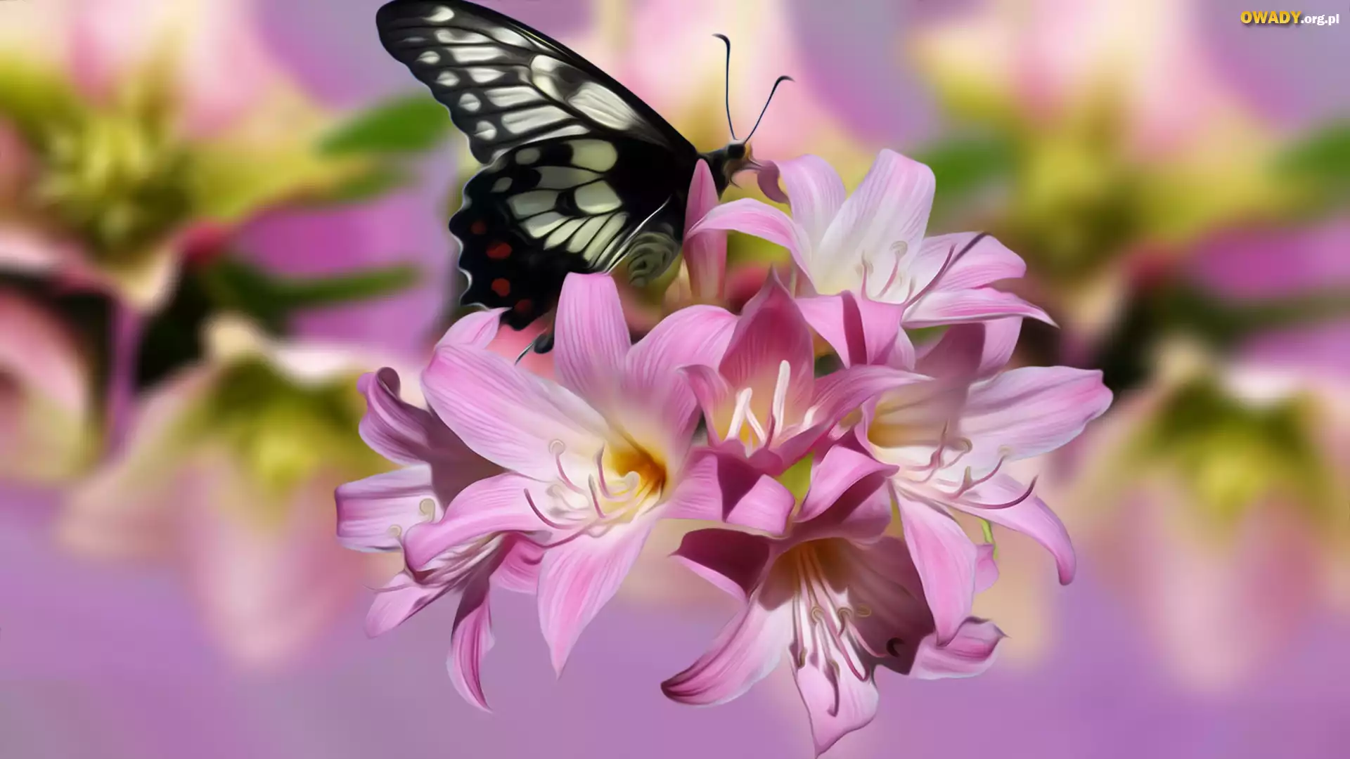 Różowe, Kwiaty, Motyl, Grafika