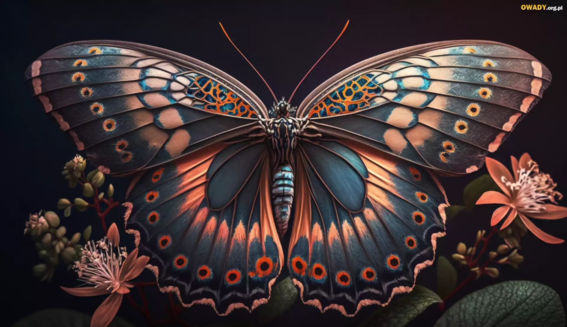 Kolorowy, Motyl, Rozpostarte, Skrzydła, Kwiaty, Grafika