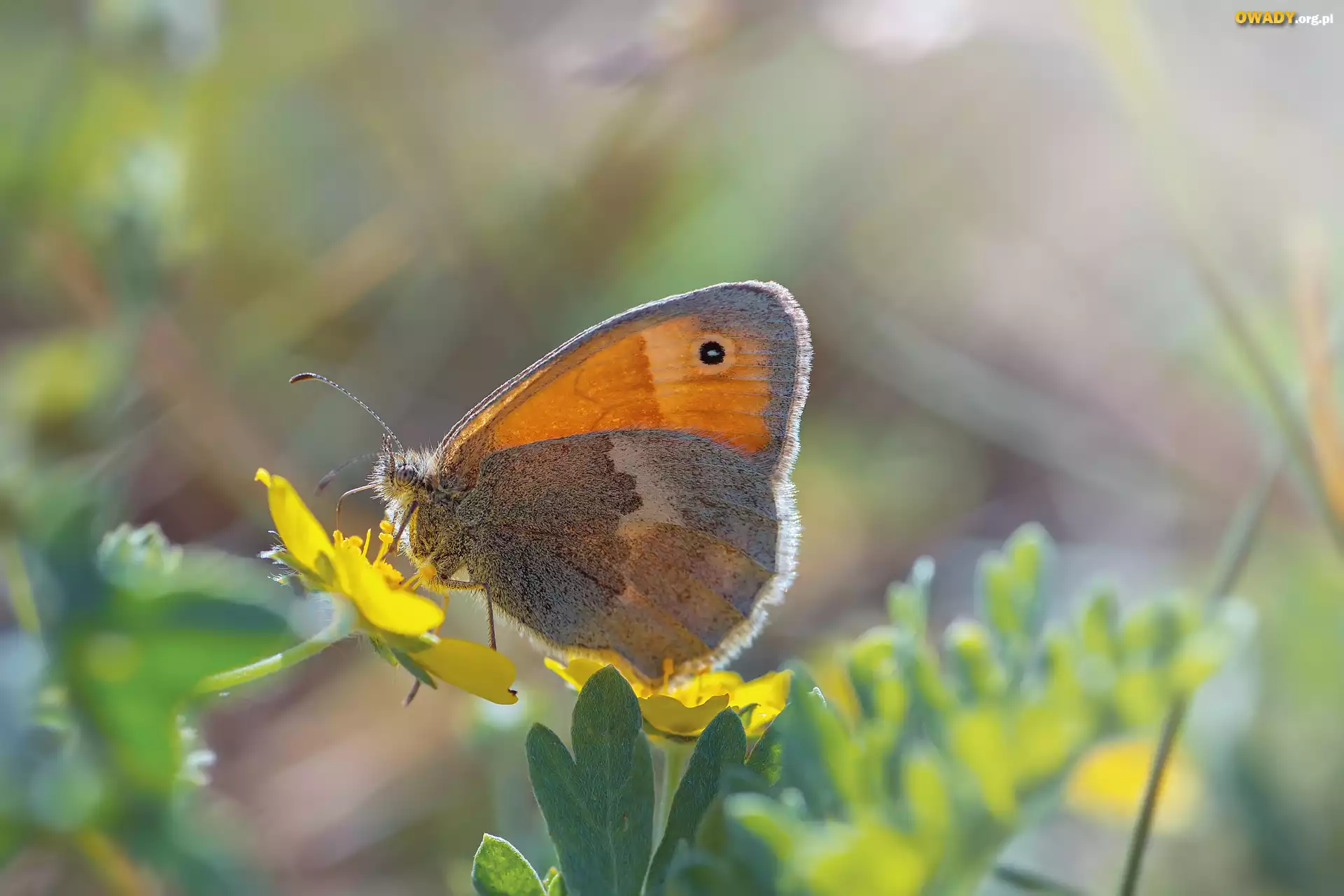 Motyl, Strzępotek ruczajnik, Żółte, Kwiaty, Rozmyte tło