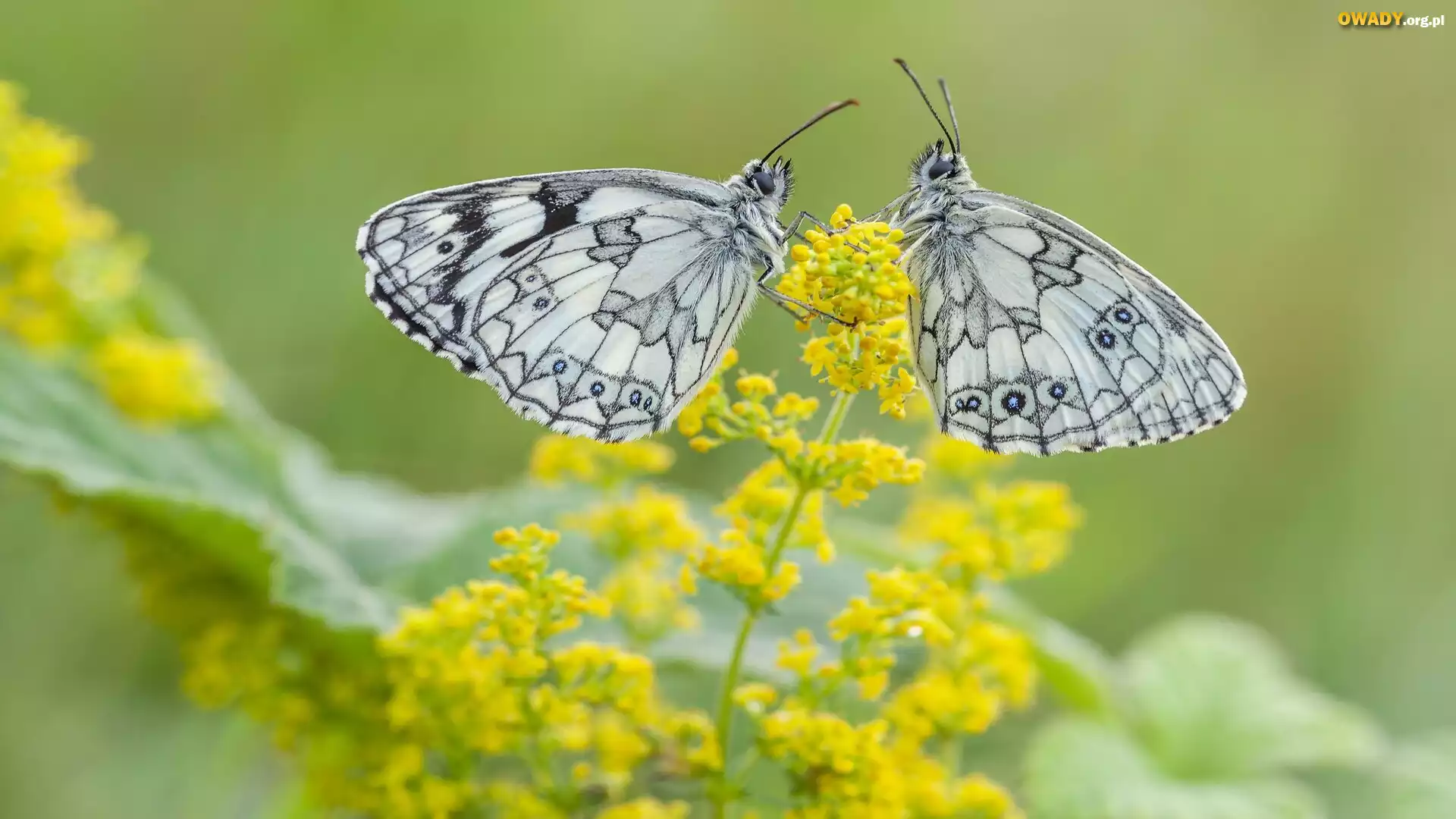 Dwa, Motyle, Polowiec szachownica, Żółty, Kwiat