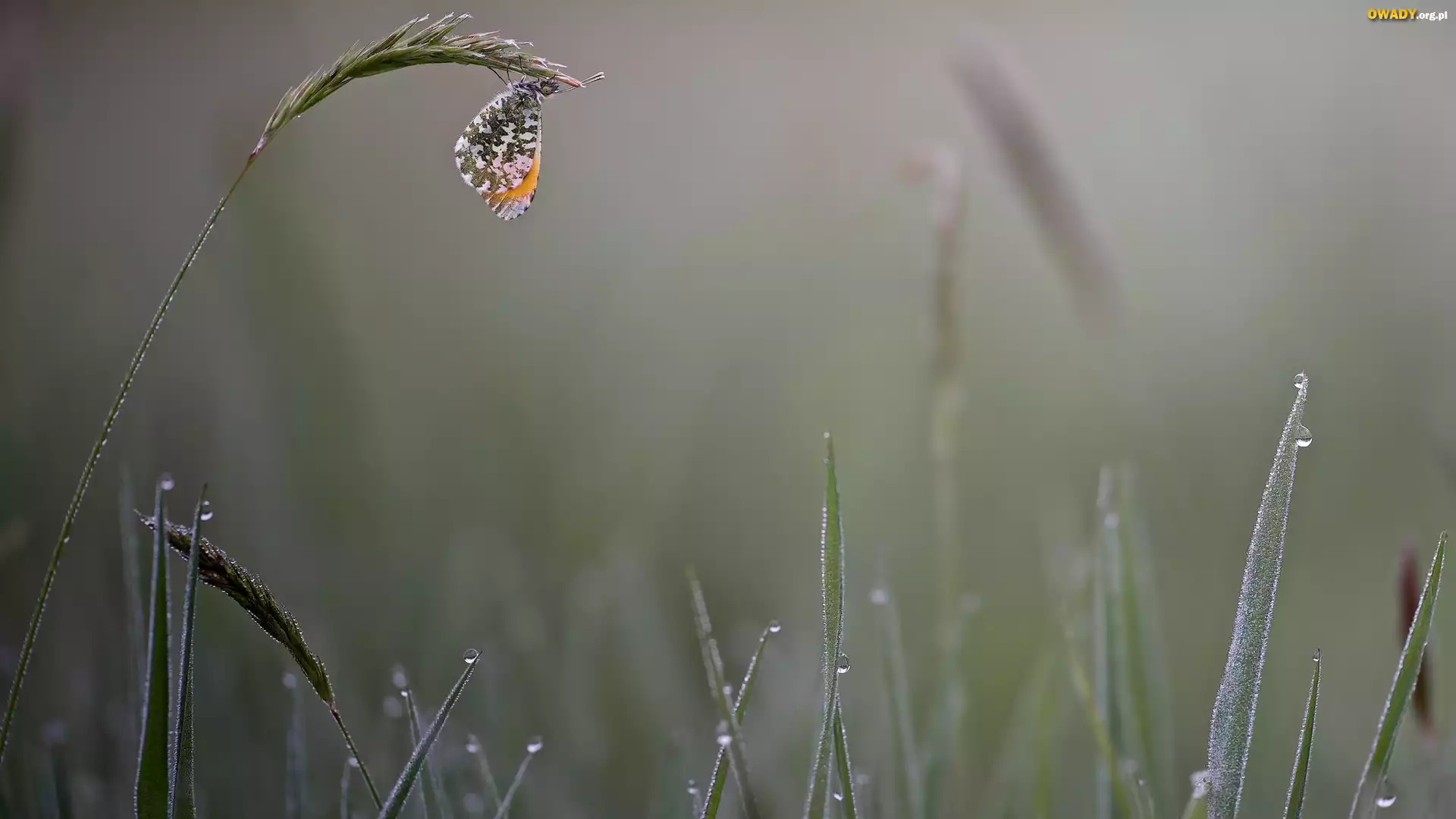 Motyl, Zorzynek rzeżuchowiec, Trawa, Krople