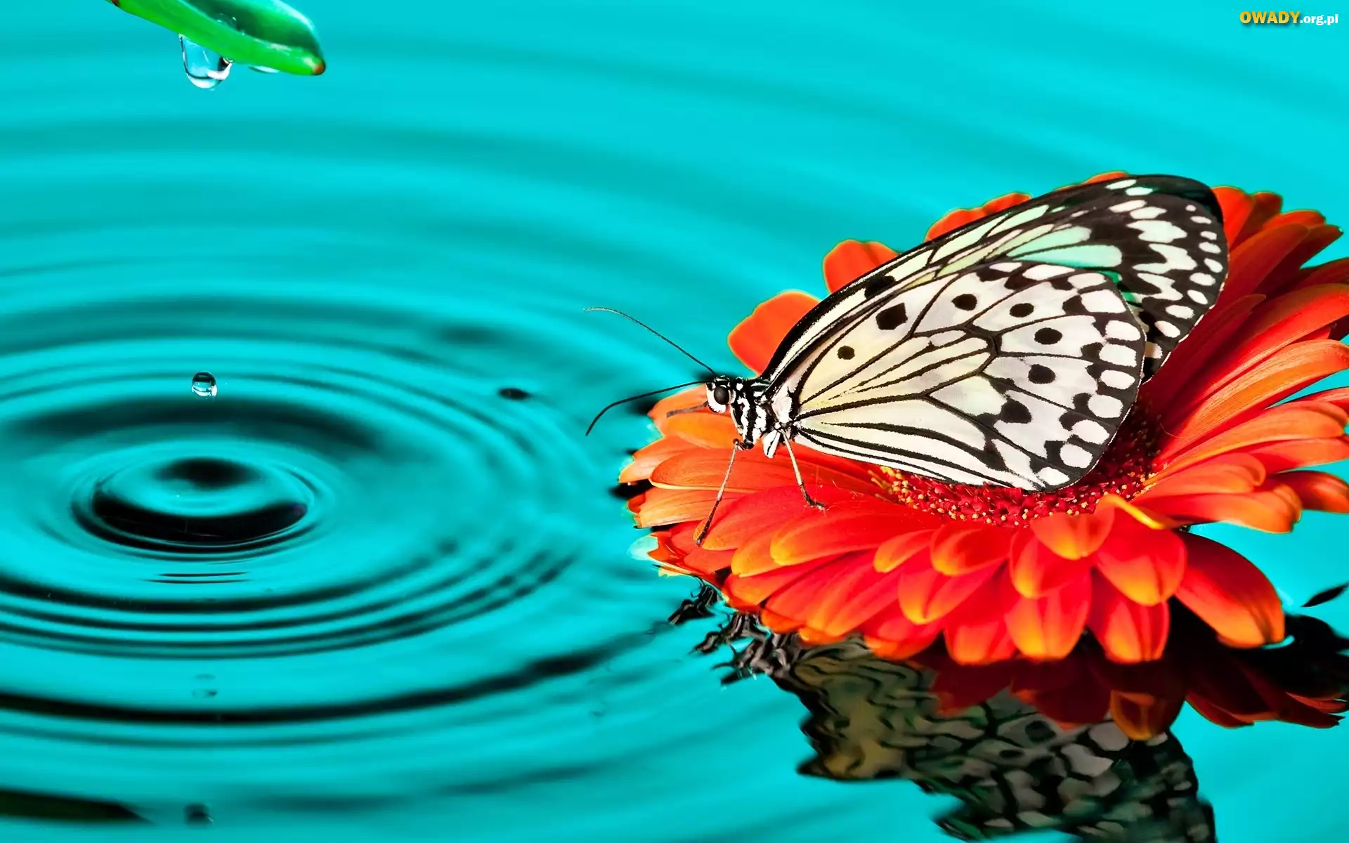 Woda, Motyl, Polowiec szachownica, Kwiat, Gerbera